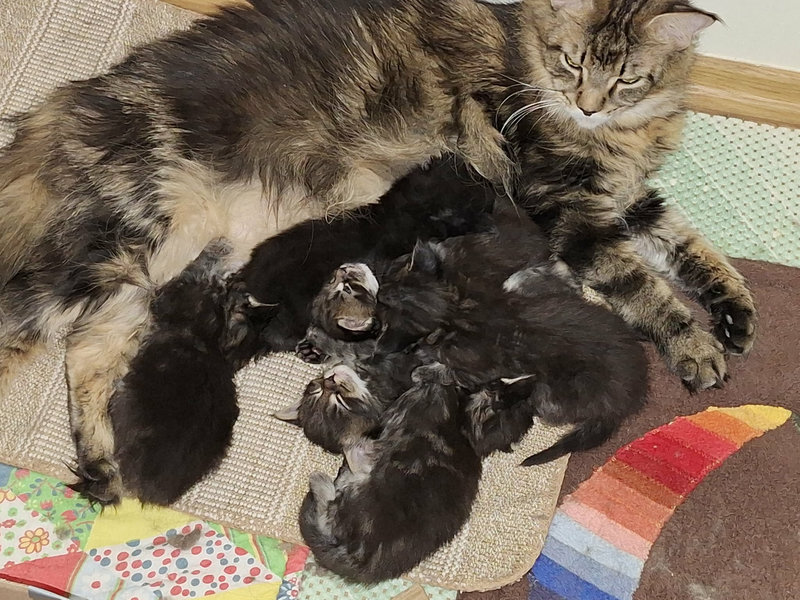 W dniu 12.12.2025 r. urodziła się szóstka kociąt: 3 koteczki (2 czarne pręgowane klasycznie i 1 czarna solid) oraz 3 kocurki (wszystkie czarne, pręgowane klasycznie).