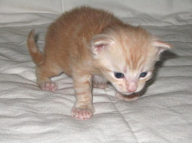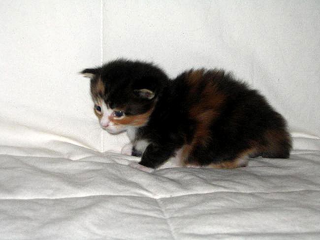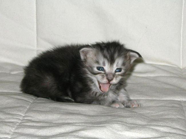 Waga każdej panienki przekroczyła już magiczne pół kilograma. Kocurek ma trochę do nadrobienia. Jest za to najsprawniejszy - już zaczyna biegać, nie zwracając uwagi na to, że jeszcze nie opanował do końca chodzenia. Jest niecierpliwy i działa szybko, co czasami kończy się nieplanowanym przewrotem przez łepek. Nie zraża go to zbytnio, bo hołduje zasadzie: Hajda do przodu! Drzewa, ludzie i inne przeszkody z drogi, bo przejadę! Jest też najlepszy w technikach podgryzania. Ząbki wyrosły mu może dzień później niż siostrom, ale za to doskonale wie jak ich używać.