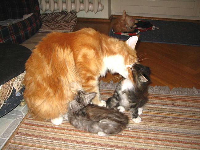 A cioteczka Bajra? Cała ona. Zachowuje się jak dziewiętnastowieczna podstarzała panna. Najpierw ostrożnie zaglądała do kojca, unikając jednak fizycznego kontaktu z małymi paskudztwami rojącymi się za zagrodą. Teraz często siedząc na stołku zapuszcza żurawia za linię Kocinota, ale kiedy wchodzi do biblioteki udaje, że tam żadnych kociąt nie ma.
