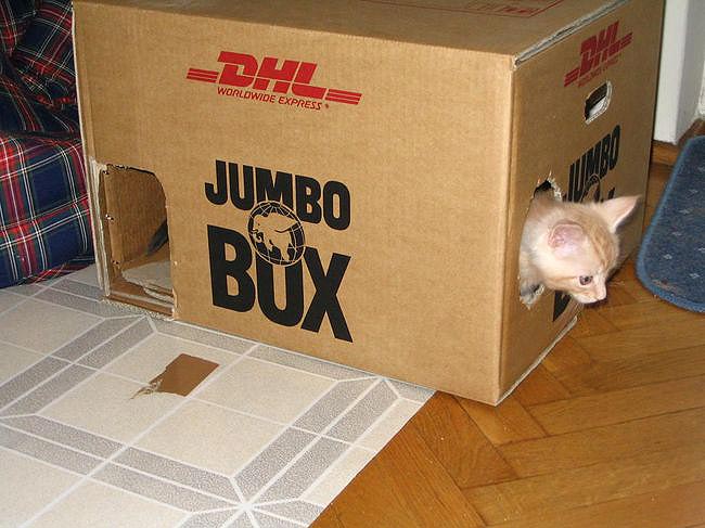 Zwykłe pudło i kilka otworów, a zabawa na całego. Można się ganiać w kółko, przebiegając przez wnętrze. Można udawać zdobywcę twierdzy włażąc na wierzch, można przez otwory grać z mama lub rodzeństwem w łapki. Kiedy ktoś narazi się mamuni może zwiać do środka. Jeśli ona zacznie się tam gramolić, trzeba dać nogę na drugi koniec pokoju i zrobić niewinny wyraz pyszczka: Jaaaaa????